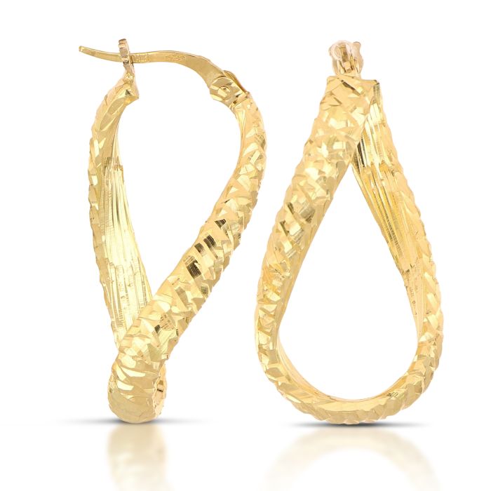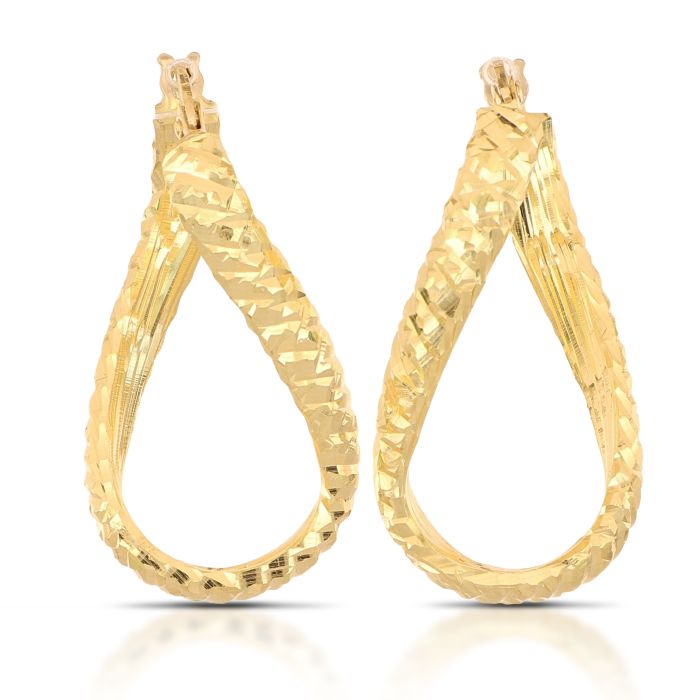 Eleganti cerchi in oro 18kt, dal design fantasia a seziona quadrata, lavorati a canna vuota e con finitura martellata. Un modello raffinato e leggero, perfetto per impreziosire ogni look con un tocco di stile unico.